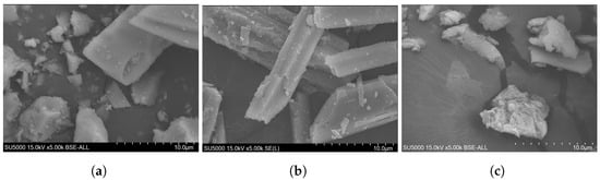 SEM micrographs of fillers: (a) Feldspar IMX424, (b) Wollastonite 1250 mesh, and additive: (c) Xanthan Gum.