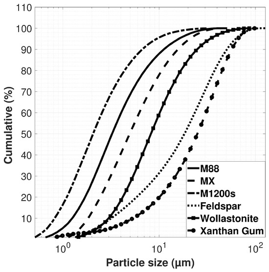 The particle size distribution of metakaolins and fillers was thoroughly investigated through laser analysis using the Malvern Mastersizer 3000 (Malvern Panalytical, Malvern, UK), and the findings of this study are summarized and visually presented in Figure 3 alongside the median particle size data presented in Table 2.