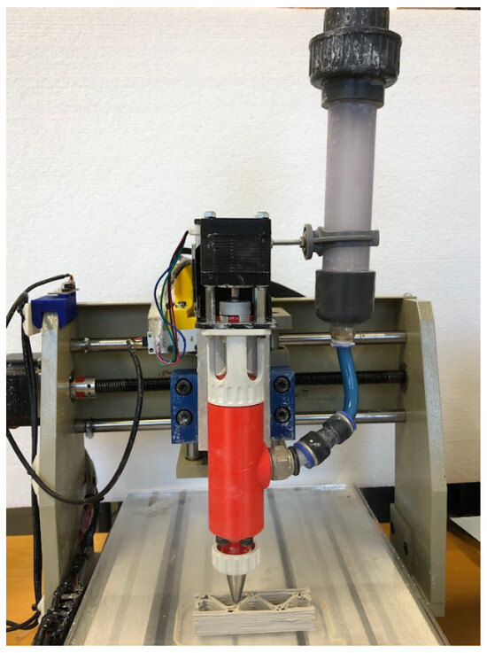 Our custom-built 3-axis gantry printer, developed in-house, is designed for building 3D-printed geopolymer-based composites. As shown in Figure 4, this printer can construct specimens up to 360 mm (Length) × 240 mm (Width) × 40 mm (Height). It operates using a piston extrusion mechanism powered by compressed air, reaching pressures up to 10 bars. This system is crucial for handling the viscous and shear-thinning properties of geopolymer pastes, which require controlled extrusion to maintain structural integrity [39]. Air pump pressure was carefully controlled between 1.5 and 4.5 bars, depending on the rheology of the mixture, to ensure consistent extrusion.