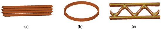 This study employed nozzle diameters, spanning from 0.6 mm to 9.5 mm, to thoroughly assess the printability of geopolymer mixtures on a polypropylene surface. A range of shapes, including straight-wall, cylindrical and complex designs, were printed to evaluate extrusion behavior and structural integrity. Figure 5 presents the geometries after slicing, prepared using PrusaSlicer. These sliced models showcase the layer-by-layer breakdown of the structures, ready for 3D printing. The first test, involving a four-layer wall printed with a 9.5 mm nozzle (Figure 5a), focused on layer bonding and its effect on the stability of the first layer. Image analysis and MATLAB-based automation were used to standardize print quality assessment, monitoring geometric accuracy and the impact of layer deposition on factors such as deformation and sagging. The second test, using a 2 mm nozzle (Figure 5b), aimed to assess precision and stability when printing finer geometries, while also observing how curved trajectories influenced the elasticity of the formulations. Finally, the third test involved printing a complex geometry (Figure 5c) to study the impact of material flow on structural stability, particularly in intricate shapes. Additionally, we aimed to examine how printing at various angles impacted the deposition and quality of the printed strand, focusing on how these orientations influenced the overall performance and consistency of the formulation. These tests provided a comprehensive understanding of geopolymer performance, optimizing both material composition and extrusion parameters to enhance 3D printing quality by addressing key factors like deformation, sagging, and structural stability [39,40].