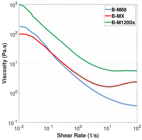 B-MX displays an initial shear-thinning behavior, starting at 100 Pa.s and reaching 3.8 Pa.s at a shear rate of 1 s−1. This lower viscosity is primarily attributed to its broader particle size distribution, approximately 5 μm, compared to M1200s and M88 (Figure 3). The diverse particle sizes in MX metakaolin diminish the impact of interparticle forces, leading to reduced viscosity. Additionally, MX has the smallest specific surface area among the three metakaolins, measured at 22.864 m2/g, as shown in Table 2, indicating less surface available for interparticle interactions. This combination of a broader particle size distribution and a smaller specific surface area accounts for B-MX having the lowest viscosity among the examined binders. An intriguing turning point is observed when the viscosity begins to increase slightly, transitioning into a shear-thickening behavior, ultimately reaching 2.35 Pa.s at 100 s−1. This transition could be attributed to the rise in viscosity, likely driven by turbulent flow, as elevated shear rates can induce such effects [46].