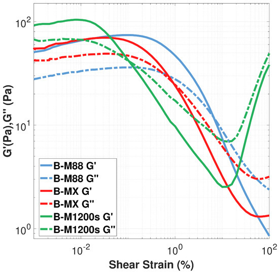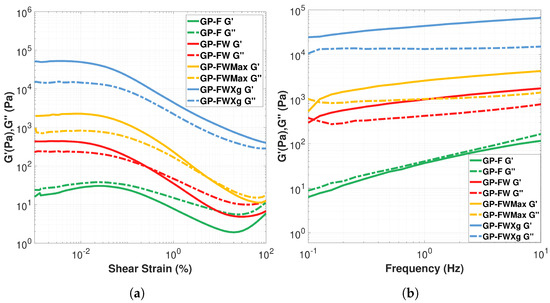 Oscillatory shear rheology involves the periodic variation in shear stress or the rate of strain in shear flow kinematics over time [36]. The first test is the amplitude sweep, where a material undergoes increasing strain or deformation amplitudes at a fixed frequency [37]. To determine the transition of the material’s state from linear to non-linear viscoelastic regions, a stress sweep ranging from 0.001% to 100% was conducted, with a fixed frequency of 1 Hz for all samples [31,35,38]. The second test is the frequency sweep, a rheological testing technique characterizing the viscoelastic behavior of materials across a range of frequencies. The frequency range covers at least three decades, specifically from 0.1 Hz to 10 Hz, and the stress sweep was set at 0.01% to capture the material’s full behavioral spectrum [31].