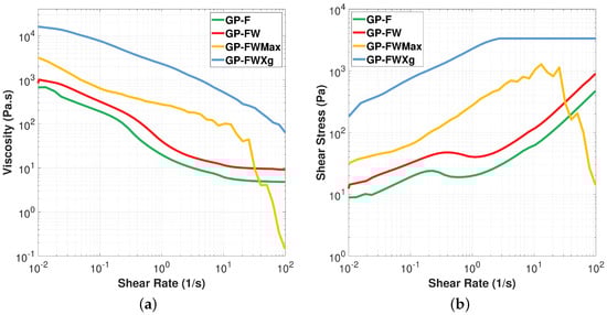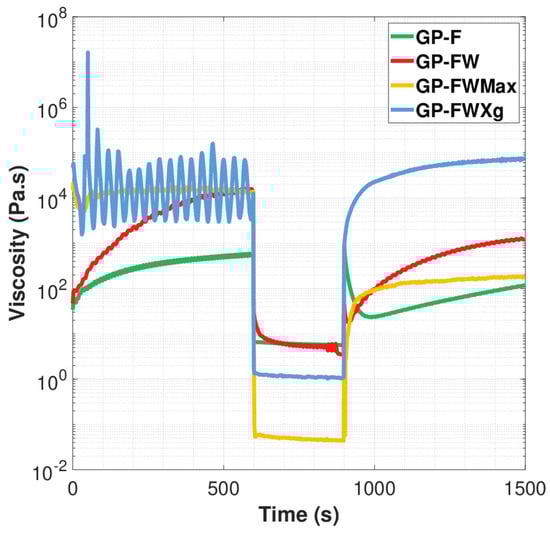 In the formula GP-FWXg, a distinctive observation emerges at the test’s initiation with a very low shear rate of 0.001 s−1, revealing a sinusoidal viscosity pattern in Figure 10, indicative of substantial flocculation. This complex behavior arises from Xanthan gum’s ability to form a three-dimensional network, creating a gel-like structure in liquids [71]. At extremely low shear rates during testing, Xanthan gum promotes molecular bonding, leading to the formation of denser aggregates or network structures [57]. These structures may demonstrate a sinusoidal response as they pass through the rheometer, reflecting variations in viscosity or deformation specific to this phase of the test. However, it is also possible that the sinusoidal pattern observed is partially due to noise from the rheometer itself, highlighting the need for careful interpretation of such behaviors at very low shear rates.