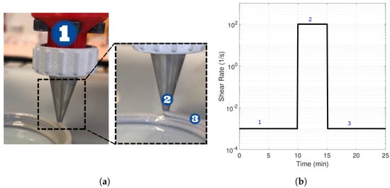 Continuous shear rheology involves applying a constant, steady shear rate to a material over a sustained period. This testing method is valuable for understanding the long-term behavior of materials, encompassing aspects such as flow properties, viscosity and shear-thinning behavior [36]. The first test focuses on the viscosity–shear rate relationship, highlighting variations in the viscosity of geopolymer composite material during 3D printing. To characterize our formulations, a shear rate ramp protocol ranging from 0.01 to 100 s−1 over a 10 min period was employed. The second test, known as the three interval-time-thixotropy (3ITT) test, involves a series of stages: an initial low shearing interval at 0.001 s−1 to assess the preserved geopolymer-based composite structure’s viscosity, followed by a phase of structural breakdown at elevated shear rates of 100 s−1. Subsequently, the material returns to a low shear interval of 0.001 s−1 to observe the process of structural reformation.