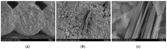 The 10 µm scale image, as shown in Figure 19c, reveals well-defined interfaces with excellent adhesion between the geopolymer matrix and the fillers. The distinct morphology of the wollastonite fibers, as evident at this scale, further confirms their alignment and interaction with the matrix. The fibers’ needle-like structure provides reinforcement, improving the composite’s resistance to cracking and deformation under load.