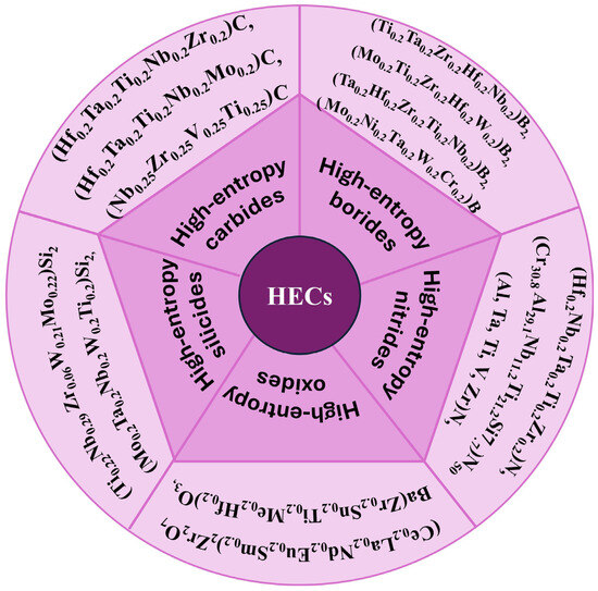 The definition of high-entropy ceramics (HECs) is still evolving; however, one characteristic feature is that they are composed of multiple elements in roughly equal atomic proportions, which creates a highly disordered crystal structure. Some researchers have defined HECs as materials consisting of five or more different cations or anions, with examples including (Zr0.2Ta0.2Hf0.2Nb0.2Ti0.2)C for high-entropy carbides and (Zr0.2Hf0.2Ta0.2Nb0.2Ti0.2)B2 for high-entropy borides. The same alloying elements can form HECs with nitrogen, carbon, boron, and oxygen, leading to compounds such as high-entropy oxides (e.g., (Mg0.2Co0.2Ni0.2Cu0.2Zn0.2)O) and high-entropy nitrides (e.g., (Hf0.2Ti0.2Zr0.2Nb0.2Ta0.2)N). They remain a relatively new class of materials, with the first reports of their synthesis emerging in 2014 [1,2].