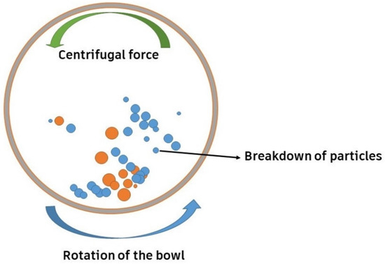 Among several synthesis techniques, conventional sintering has been a usual technique to synthesize such ceramics. However, the arrival of the flash-sintering technique has led to improved densification at lower temperatures and less time [44,46,47]. High-energy ball milling (HEBM), which involves the collision of a powder mixture with high-energy balls to produce a uniform dispersion, is also utilized for producing HE carbides, as shown in Figure 3. The balls (orange color) represent milling balls, while the smaller particles (blue color) represent the powder being milled. The relationship between the balls and the powder is crucial for the milling efficiency, as an optimal ball-to-powder ratio ensures effective energy transfer, leading to proper particle size reduction. An imbalanced ratio, either too much powder or too little, can reduce the efficiency of the milling process. The ideal ratio depends on the specific materials and desired milling outcomes, with 10:1 being a common starting point. A combination of the constituent powders is placed into a grinding jar, along with grinding balls. The grinding jar is then placed on a rotating platform, which causes the grinding balls to tumble and mix the powders. The collision and friction between the grinding balls and the powders lead to a reduction in the particle size and an increase in the homogeneity of the mixture [59]. Moskovskikh et al. [60] synthesized the HE carbides Ta0.2Nb0.2Hf0.2Ti0.2Mo0.2C (HECMo) and Ta0.2Hf0.2Nb0.2Ti0.2Zr0.2C (HECZr) by reactive high-energy ball milling. They found that 60 min of the process was sufficient to prepare the FCC solution. They also proclaimed that the bulk HECs produced using this approach have fine particle diameters. It was observed that the mechanical properties of the HECs improved when the grain size was reduced [49].