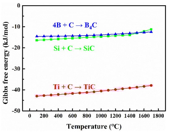 As shown in Figure 1, the Gibbs free energy of the reaction of Ti with C is significantly more negative than that of B or Si with C, indicating that Ti reacts more readily with C than B or Si. Therefore, Ti can play the role of consuming graphite. Although the reaction between B and C is as difficult as that between Si and C, Si has a high melting point of 1410 °C, and its liquid phase sintering significantly promotes densification [21]. Taking the above factors into consideration, in order to achieve the preparation of diamond composites with excellent mechanical properties under non-extreme conditions, Ti and Si were selected as absorbents to adsorb the products of diamond graphitisation and combined with spark plasma sintering to fabricate diamond–ceramic composites.