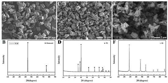 SEM images and corresponding XRD patterns of the raw materials: (A,B) diamond; (C,D) Ti; and (E,F) Si.