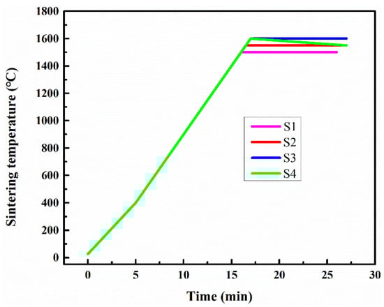 The diamond, Ti, and Si powders were weighed in a 4:3:3 mass ratio and placed in a 250 mL polyethylene jar. After injecting anhydrous ethanol into the jar, the mixture was milled using a planet mill (QXQM-2, Changsha Tianchuang Powder Technology Co., Ltd., Changsha, China) at 200 rpm for 2 h. The collected slurry was separated using a rotary evaporator (R206B, Shanghai SENCO Technology Co., Ltd., Shanghai, China) and then dried in a vacuum drying chamber (DZF-6020, Shanghai Jinghong Laboratory Instrument Co., Ltd., Shanghai, China) for 24 h to remove residual ethanol. The as-received powder mixture was sieved through a 100-mesh sieve to minimise agglomeration. Subsequently, the powder was placed in a graphite die with an internal diameter of 50 mm and sintered in a spark plasma sintering furnace (D60, FCT Systeme GmbH, Rauenstein, Germany). As shown in Figure 3, four different sintering processes were designed: first, the temperature was increased from room temperature to 400 °C in 5 min and further to 1500 °C, 1550 °C, and 1600 °C at a speed of 100 °C/min, each held for 10 min. In another experiment, after the sintering temperature rose to 1600 °C, it dropped to 1550 °C within 10 min. Sintering was performed in an Ar atmosphere, and the axial pressure was maintained at 50 MPa. The samples prepared at the sintering temperatures of 1500 °C, 1550 °C, 1600 °C, and 1600→1550 °C are denoted as S1, S2, S3, and S4, respectively.