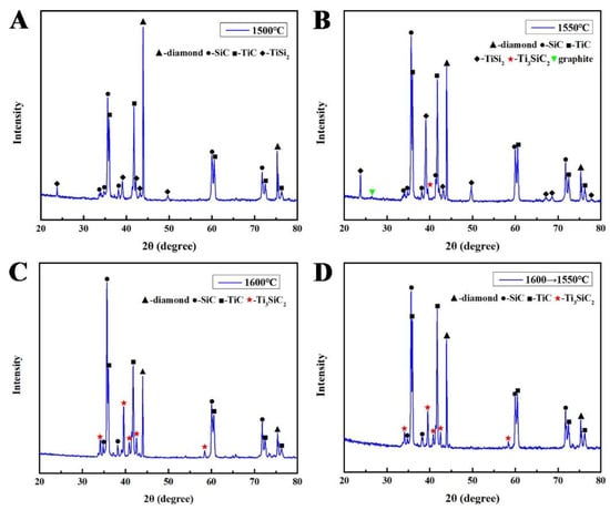 Figure 5 shows the XRD patterns of S1, S2, S3, and S4. Ti and Si disappeared from the spectra. The diamond peak intensity decreased gradually with increasing sintering temperatures, indicating increased diamond graphitisation. Simultaneously, the amounts of the main reaction products, SiC and TiC, increased. This is because, as the sintering temperature increased, both the carbon source (graphite) and the reaction-driving force increased simultaneously. As shown in Figure 5A, the intermediate product, TiB2, existed only at sintering temperatures below 1500 °C. At 1550 °C, the XRD peak of TiSi2 enhanced, and a new product, Ti3SiC2, appeared. Increasing the sintering temperature further enhanced the crystallinity and the diffraction peak intensity of TiSi2. Because diamond graphitisation was increased at higher temperatures, C reacted with TiSi2 to form Ti3SiC2. When the temperature rose to 1600 °C, the content and crystallinity of Ti3SiC2 were further increased. At this point, the diffraction peak of TiSi2 disappeared, and in the presence of sufficient graphite, all the TiSi2 was transformed into Ti3SiC2 according to Equation (1).