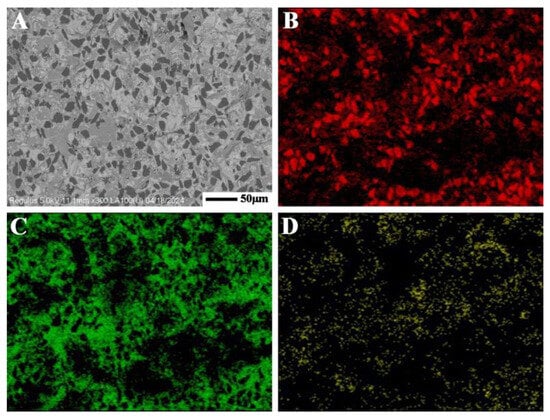 Element distribution of the diamond–ceramic composite sintered at 1500 °C: (A) backscattered electron image, (B) C, (C) Si, (D) Ti.