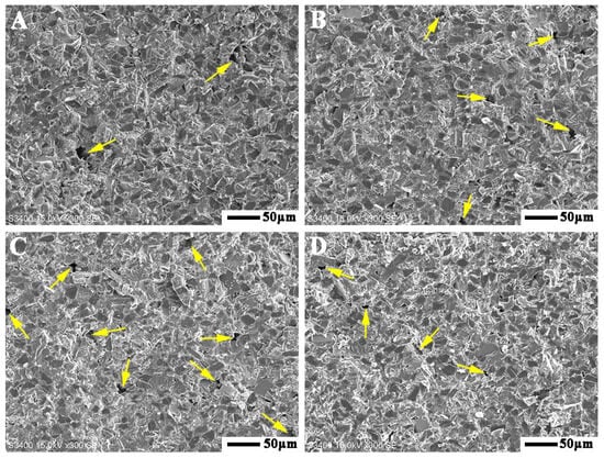 Figure 7 shows the fracture surfaces of the diamond–ceramic composites. The samples prepared at different sintering temperatures exhibited a high degree of densification. However, some holes with larger dimensions were observed, as indicated by the yellow arrows. Compared to the results in Figure 2A, these holes were only slightly smaller than the raw diamond particles. This implies that these holes were caused by the elimination of the diamond particles. Moreover, Figure 7 shows that the number of holes on the fracture surface increased with increasing sintering temperature. At high temperatures, diamond transformed into graphite, which possessed a weak interlayer binding force. Therefore, after the outer layer of the diamond graphitised, the diamond particles were easily removed when the material fractured. The graphitisation rate of diamond increased with increasing sintering temperature, and because the graphite could not react with Ti or Si over time, the pull-out phenomenon of diamond particles increased. Although no graphite phase was detected in the XRD patterns, it can be inferred that a small amount of graphite was present in these samples. This is also why the volume density of the sample decreased with increasing sintering temperature.