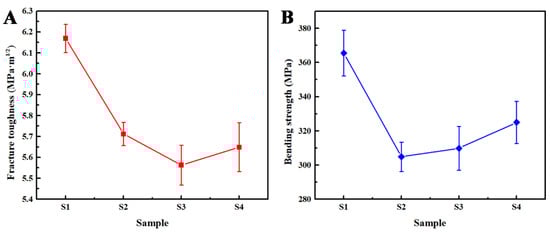 As shown in Figure 8A, the fracture toughness of the diamond–ceramic composites decreased with increasing sintering temperature. The fracture surfaces in Figure 7 reveal that the fracture mode of the diamond–ceramic composite was a combination of transgranular and intergranular fractures. Intergranular fractures contributed to the toughening of crack deflection [22]. Crack deflection mainly occurred around the diamond phase because the thermal expansion coefficients of the diamond and ceramic phases differed significantly, and an interface with a weak bonding force was formed after diamond graphitisation. The prolonged cracks caused by crack deflection consumed more fracture energy, resulting in increased fracture toughness [23]. The degree of crack deflection depends on the size of the diamond particles, and the energy consumed per unit length of the crack depends on the interface bonding strength. With increasing sintering temperature, the degree of graphitisation of the diamond increased, thus decreasing the diamond size and weakening the interface bonding. Consequently, the fracture toughness of the diamond–ceramic composite was reduced.