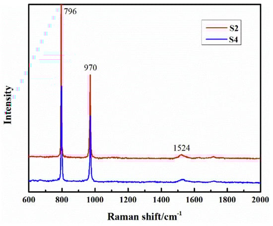 Compared with XRD, Raman spectroscopy is more sensitive in detecting graphite. Therefore, Raman spectroscopy was performed to characterise the reaction product accumulation area around the diamond. As shown in Figure 9, the characteristic peaks at 796 cm−1 and 970 cm−1 correspond to SiC, and the characteristic peak of graphite was observed at 1524 cm−1 [30]. Although the average temperature of S4 was higher than that of S2, the higher initial temperature activated reaction (1), resulting in higher graphite consumption and a weaker characteristic peak strength of graphite in S4 than that in S2. Consequently, the diamonds in S4 had smaller sizes and stronger interfacial bonds. This unique variable-temperature sintering results in a higher bending strength of S4 than that of S2 and S3.