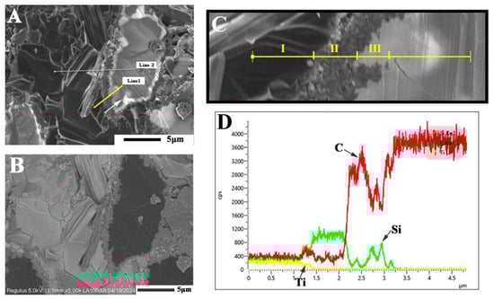 Figure 10A,B show the line-scan images of the diamond–ceramic composite. The grey-white, grey-black, and black regions correspond to Ti3SiC2, SiC, and diamond, respectively. Figure 10C shows an enlarged image of Line 1 (yellow line), and the structure of the above regions can be determined after analysis in combination with Figure 10D. As shown in Section I of Figure 10C, Ti, Si, and C were present simultaneously with their stable contents, confirming that this region was Ti3SiC2. In Section II, Ti disappeared, the Si content increased, and the Si and C contents were relatively stable, indicating the region as SiC. Section III contained only Si and C elements; however, their contents were unstable, indicating that a part of this region was graphite and the other part was a solid solution formed after Si elements were diffused into the diamond. The remaining area contained only C with a stable content, indicating a stable structure of diamond. Complex structures around diamonds were formed by a combination of diffusion, phase transitions, and chemical reactions.
