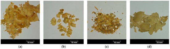 Samples of composition 0.20BiScO3·0.45PbTiO3·0.35PbMg1/3Nb2/3O3 (denoted as 0.20BS·0.45PT·0.35PMN) were synthesized by ceramic technology (type 1) and the melt-hardening method (type 2). Oxides (Bi2O3, Sc2O3, Pb3O4, TiO2, MgO, Nb2O5) of OSF grade containing at least 99% of the basic substance were used as starting reagents. To prepare the charge, the starting reactants were taken in stoichiometric ratios and ground in a planetary mill until homogeneous. Then, the mixture was pressed into tablets and fired in a muffle furnace at T = 1133 K for t = 4 h. In the ceramic synthesis method, the tablet obtained after firing was re-milled (with the addition of ~1 wt.% aqueous polyvinyl alcohol solution) and pressed at a pressure of 15 MPa. Then, the tablets were sintered in a furnace at T = 1473 K for t = 2 h. In the melt method, amorphous precursors were first obtained from heat-treated (at T = 1133 K for t = 2 h) and nonthermally treated mixtures of the initial oxides by melting and quenching of the melt. Heat-treated and non-heat-treated oxide mixtures in the form of tablets were loaded into a furnace heated to 1623 K on a platinum base. The melting of the samples took place within 30 s, and the formed melt droplets fell through the gentle opening of the furnace to the quenching (cooling) device, where it was cooled sharply (quenching the melt). As a result, brightly colored (greyish yellow) precursors were formed in the quenching device, which had the following types of shapes: (a) large shiny flakes; (b) large pieces, and (c) small pieces, solidified particles, and flakes; (d) pale-looking large flakes, which were obtained by the melt-hardening method from a non-heat-treated mixture of starting oxides (in Figure 1).