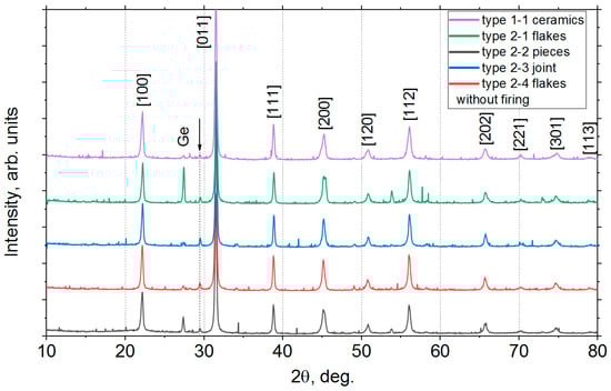 To obtain four varieties of type 2 samples, separate types of precursors were used: (a) type (2-1) flakes; (b) type (2-2) large pieces; (d) type (2-4) large flakes obtained without firing (see Figure 1). They were individually subjected to milling, pressing into tablets and isothermal firing in a muffle furnace for 2 h.