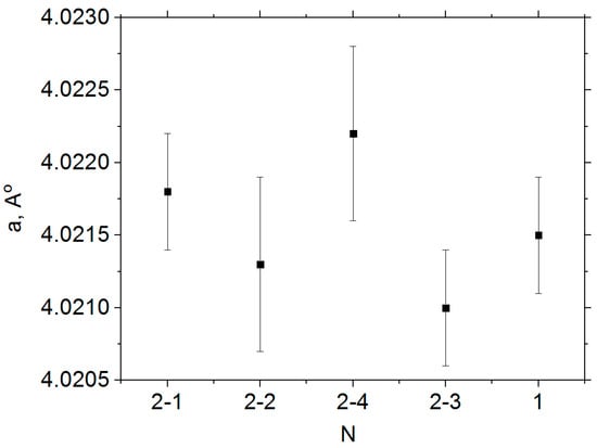It was found that polycrystals of both types have cubic symmetry. Using the CELREF program v2.0, the structural parameters of the 0.20BS·0.45PT·0.35PMN samples were determined, which correspond to the literature data [,], and are shown in Figure 3.