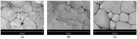 Despite different technologies (temperature regime, and time of firing of samples) of preparation of both types of investigated samples their microstructures represent well-formed polycrystals, including differently oriented crystallites, and intercrystalline boundaries. Among the three microstructures shown in Figure 4, the sample of type 2 (2-3) in Figure 4b has denser packing of crystallites. The proof of good crystallization of the samples is clear peaks on their diffractograms (Figure 2). Note that solid-phase crystallization in type 1 samples lasts for 6 h, and is divided into preliminary and final thermal annealing at 1133 K and 1473 K, respectively. Type 2 polycrystals with shorter pre-thermal annealing time (2-3) and without pre-annealing (2-4) have the same microstructure as type 1 samples. Probably, during the short time of the melting and quenching process in the precursors of type 2 samples, activation processes such as phase formation, nucleation of crystallite grains, and appearance of broken bonds occur in their structures due to abruptly temperature-gradient conditions. Obviously, the main crystallization process of type 2 samples occurs more rapidly in activation precursors during the final isothermal firing than in type 1 samples.