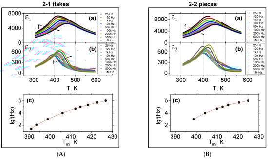The temperature-frequency dependences (a) ε1(T,f), (b) ε2(T,f) of samples of type 1 and type 2 (Figure 7a,b) show that all polarized electric dipoles of type 2 samples participate in slow relaxation processes under the action of an external applied electric field with frequency f = 1 kHz. Moreover, the dependences ε1(T,f), ε2(T,f) (Figure 7a,b) clearly show that the temperatures of the maxima of all type 2 samples coincide and are noticeably lower than in type 1 samples.