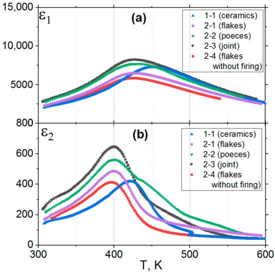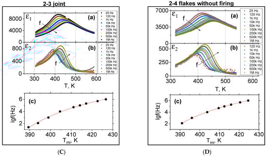 These data indicate that the frequency of oscillations of electric dipoles in all samples of type 2 is the same and equal at fm = 1 kHz to the point Tm = 420 K on the dependence ε1(T,f) (Figure 7a). On the dependence ε2(T,f), the oscillation frequency of electric dipoles reaches fm = 1 kHz at the temperature Tm = 400 K (Figure 7b). In the samples of type 1, similar temperatures are larger (on the dependence ε1(T,f) Tm = 460, and for ε2(T,f) Tm = 430) than in the samples of type 2 (Figure 7b).