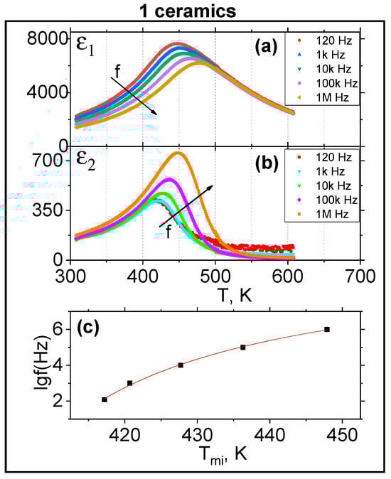 It should be noted that the solid solution of the composition 0.20BS·0.45PT·0.35PMN obtained by ceramic technology was previously classified as a ferroelectric relaxor []. Figure 5, Figure 6 and Figure 7 show temperature dependences (a) ε1(T), (b) ε2(T), measured at different frequencies. The dependences show pronounced maxima, the position of Tm1 (for ε1(T)) and Tm2 (for ε2(T)) of which shifts with increasing frequency towards high temperatures, indicating their relaxation character. The dependence of Tm(f) obeys the Vogel–Fulcher law: