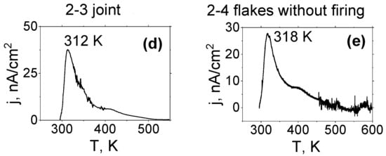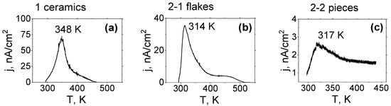 The results of the investigation of TSDC(T) dependences of the samples (Figure 8) allow us to establish that practically all samples of type 2 have higher TSDC currents (except for samples 2-2) than in samples of type 1. High TSDC currents are especially found in samples 2-1 and 2-3 (see Figure 8b,d). The temperatures of the TSDC maxima (Tmp) of type 2 samples are lower than the similar maxima of type 1 samples. These data indicate that the electric dipoles of PNRs of type 2 samples are more susceptible to the polarizing effect of the external electric field during heating, and a more smoothly depolarizing effect during cooling. Such TSDC(T) maxima are characteristic of relaxor ferroelectrics.