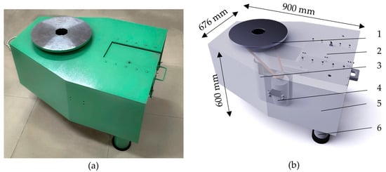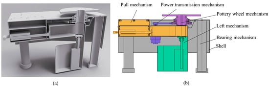 Schematic diagram of the overall mechanism of the pottery wheel machine: (a) physical display diagram of the second-generation pottery wheel machine and (b) model diagram of the second-generation pottery wheel machine (1. pottery wheel mechanism, 2. pull mechanism, 3. lifting mechanism, 4. bearing mechanism, 5. power transmission mechanism, 6. pottery wheel machine shell).