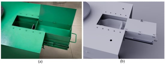 To address these issues, the new mechanism incorporates an advanced automatic feeding system. As shown in Figure 3, the diagrams depict the pulling mechanism: (a) actual system image and (b) schematic diagram of the pull mechanism model. The system employs a modular design composed of a clay storage outlet, power device, handle, partition, two sliding tracks, and two sliders. The clay storage and power device components are symmetrically positioned at the front and rear ends of the partition, each fulfilling specific functions: the former is responsible for storing and dispensing pre-stored clay materials, while the latter connects to the power system to ensure the accuracy of clay material dispensing. This design allows for the automatic, continuous, and smooth delivery of clay blanks to the work area. The core of the system lies in its precise control algorithms and real-time feedback mechanisms, ensuring the stability and reliability of the feeding process.