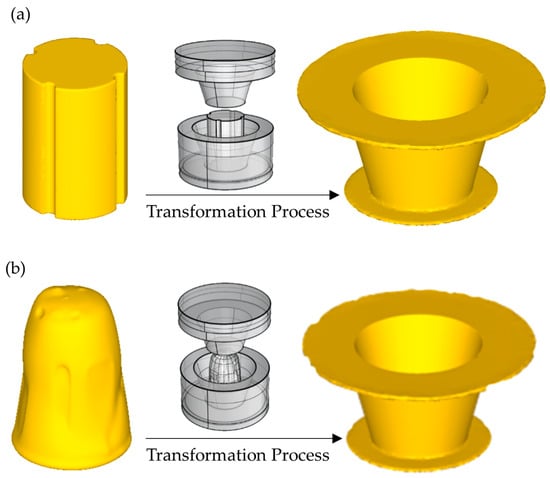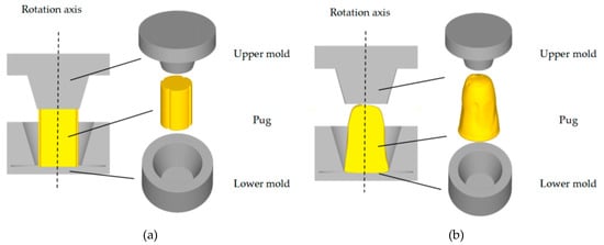 The anticipated simulation results, depicted in Figure 7b, show how the two types of clay blanks shown in Figure 7a can be processed into a simple tapered bottle. The effectiveness of the forming process in achieving the desired shape is underscored by this illustration, with the differences between traditionally prepared clay and clay optimized through the new equipment being highlighted. Valuable insights into the flow and deformation behaviors of the clay material under various conditions are offered by the simulation results, allowing for the refinement of forming parameters for optimal performance.