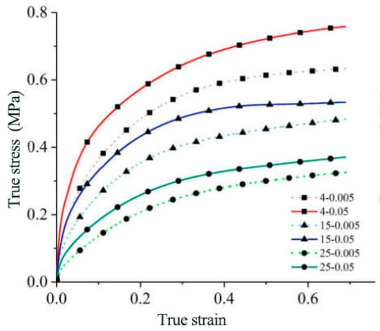 The upper mold operates with dual-motion dynamics, rotating at 25.12 rad/s and revolving at −25.12 rad/s, ensuring alignment with the clay contour and efficient shaping. Simultaneously, the lower mold contributes through axial feeding at 4 mm/s. The clay billet, serving as the primary subject of the simulation, possesses elastic–plastic material properties with stress–strain behavior illustrated in Figure 6. In Figure 6, the true strain and true stress represent the strain and stress that account for changes in material length and cross-sectional area during deformation. True strain and true stress offer a more accurate description of material mechanical behavior under deformation conditions, providing a basis for material settings in subsequent simulation experiments.