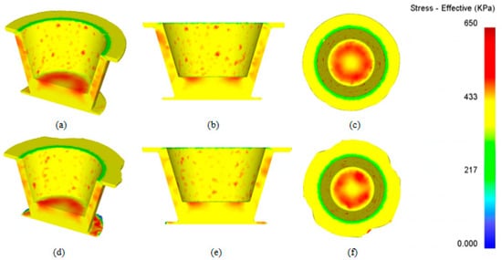 Figure 8 presents the equivalent stress contour plots for the clay simulation: Figure 8a–c optimized through our new equipment, and Figure 8d–f using traditional forming methods. From this figure, it can be observed that, due to the localized contact between the upper mold and the clay during the forming process, the equivalent stress within the contact zones is significantly higher than in the non-contact zones. The contact areas are predominantly concentrated in the central region, resulting in the equivalent stress being higher in the bottom area of the bottle compared to the wall region.