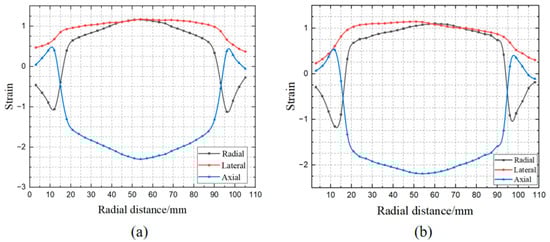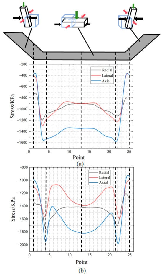 The equivalent stress contour plots primarily reflect the difficulty of plastic deformation at different locations during the clay-forming process, but they do not fully reveal the stress state of the clay. To more specifically illustrate the stress state during clay-forming, we will examine the distribution patterns of stress in three directions: radial, lateral, and axial. Figure 9 presents the directional stress distribution plots for the clay simulations, with (a) showing the results optimized through our new equipment and (b) illustrating those from traditional forming methods.