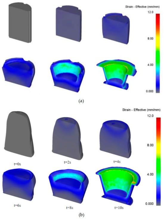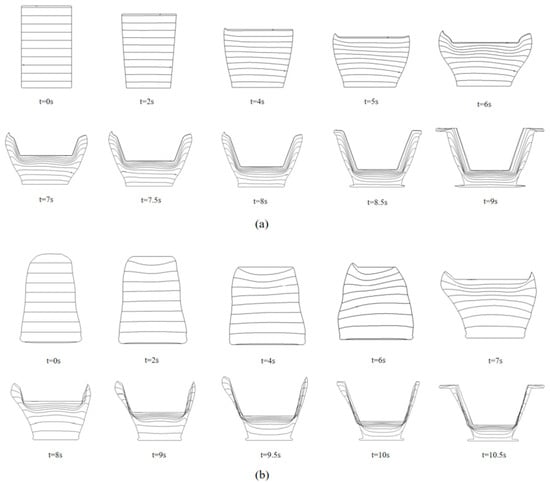 By implementing this setup, the model allows an in-depth analysis of plastic deformation patterns under various operating conditions. This reflection of real-world settings enables us to optimize forming processes and equipment design, ultimately enhancing the quality and production efficiency of ceramic products. The simulation results highlight the differences in clay behavior due to variations in equipment design, with Figure 5 presenting the outcomes for the two comparative groups: Figure 5a clay optimized by the new equipment and Figure 5b clay from traditional equipment.
