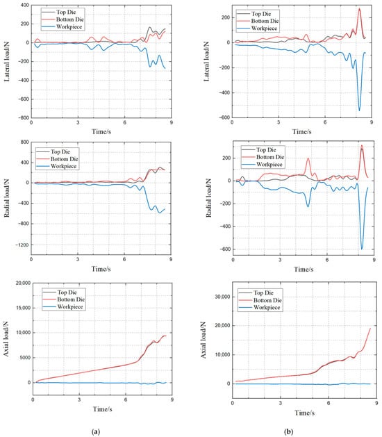 In contrast, the finishing phase shows a decreasing trend in the load curves. Here, the upper mold continues to rotate while the lower mold stops advancing, reducing the contact area and decreasing the amount of clay experiencing plastic deformation. This figure indicates that the lower mold primarily bears axial loads, while the upper mold handles radial loads. Axial loads on the lower and upper molds are equal in magnitude but opposite in direction, balancing each other. Radial loads on the lower and upper molds sum to equal the radial load on the clay, directed away from the center of the cross-shaped ring, ensuring equilibrium. Frictional forces between the clay and molds result in circumferential loads on both. The circumferential load directions on the molds are identical but oppose the clay’s load direction. The sum of the circumferential loads on the molds equals the clay’s circumferential load, achieving equilibrium.