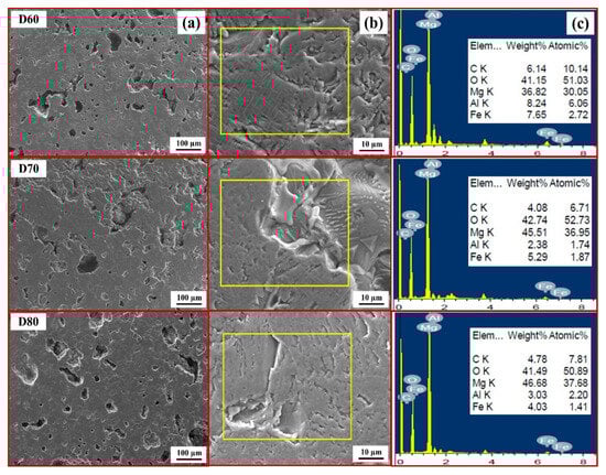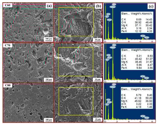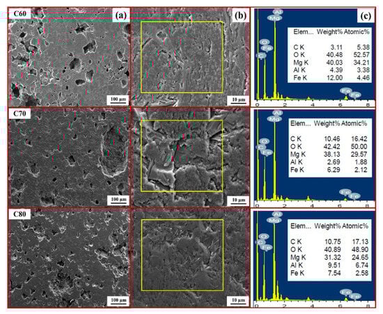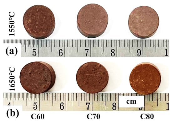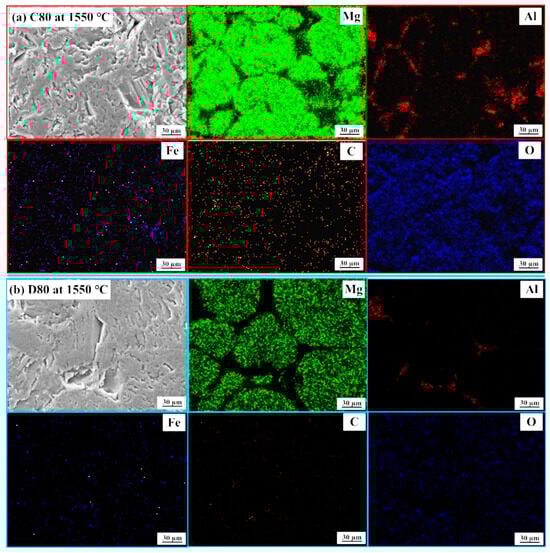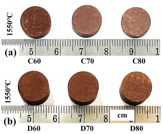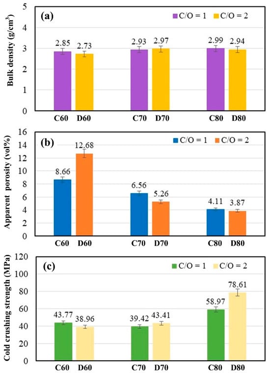 - Varying the carbon content (C/O ratios of 1 and 2) has a minimal impact on the bulk density and apparent porosity of the resulting ceramic. Increasing the magnesia powder content (60–80 wt%) does not significantly affect bulk density but tends to reduce apparent porosity. A higher MgO content combined with increased carbon concentration (C/O = 2) leads to a more notable increase in crushing strength compared with a C/O ratio of 1. At 1550 °C, the pellets with the highest MgO content (C80 and D80) exhibit the greatest cold crushing strength.