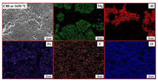 - The produced magnesia–hercynite-based refractories consist of equiaxed MgO grains and an FeO-Al2O3 spinel phase at the boundaries. The formation of MgFeAlO4, CaMg(SiO4), and Ca3Mg(SiO4)2 is anticipated to occur throughout the bulk ceramic, but it is primarily concentrated at the red regions or boundaries of the MgO grains.
