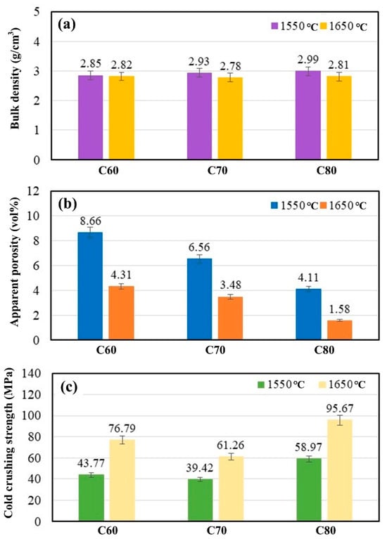 - Increasing the heating temperature from 1550 °C to 1650 °C results in a slight reduction in bulk density and a significant decrease in apparent porosity, enhancing the ceramic’s densification and compactness. This leads to a notable improvement in mechanical properties, with cold crushing strength nearly doubling from 43.77–58.97 MPa at 1550 °C to 76.79–95.67 MPa at 1650 °C.