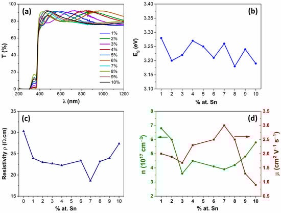 | TZO Composition | d (µm) | Tvis (%) | Eg (eV) | n (cm−3) | µ (cm2V−1s−1) | r (W.cm) | Ip/Id | t (s) | Reference |