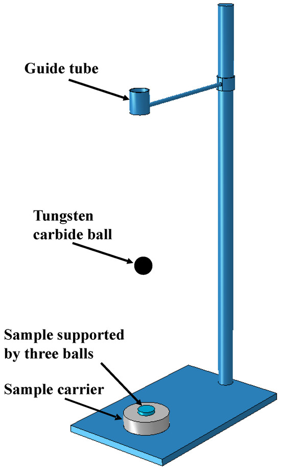 To evaluate the impact resistance of the studied materials, drop-ball impact tests were performed using a device developed in a laboratory, a schematic representation of which is shown in Figure 1. The mirror-polished surface of the disk-shape samples was placed on three balls equidistant from its center, arranged in a circle of 16 mm in diameter (as would be the case in biaxial bending tests). A tungsten carbide ball of 26.5 g weight and 15 mm in diameter was then dropped onto the center of the disk. The drop heights were chosen between 10 cm and 40 cm (with increments of 5 cm or 2.5 cm for more precision) to include, for all three ceramics, heights where no failure was observed towards heights for which all samples broke. For each material, six samples were tested at each drop height. The results were then analyzed in terms of failure probability, calculated as the ratio of the number of fractured samples to the number of tested samples under the same conditions (i.e., six samples), versus height. For each material, a critical height (HC)—corresponding to the drop height at which at least one sample among the six fractured (non-null failure probability)—was determined.