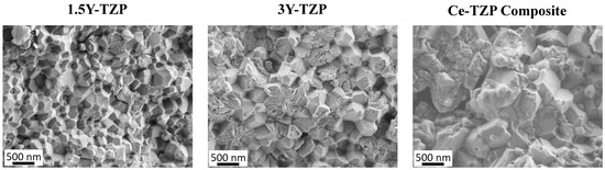 The density, Vickers hardness, and the zirconia grain size are presented in Table 1. SEM micrographs of fractured surfaces are show in Figure 2. All materials exceeded 99% of the theoretical density, indicating almost full densification. The Vickers hardness falls within the typical range for Y-TZP and Ce-TZP composites [45,46,47], with a lower value for the latter. The initial monoclinic phase content on polished surfaces was less than 5 vol.% for all studied materials.