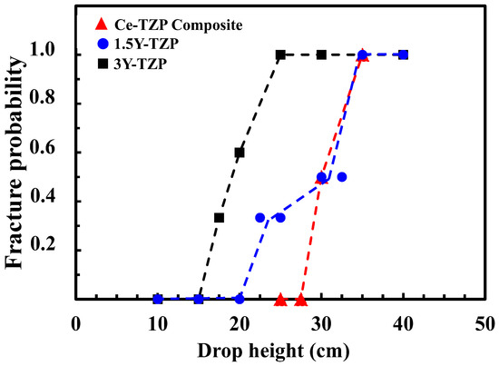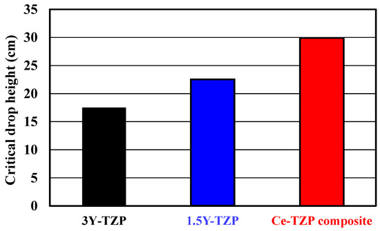 Figure 3 summarizes the results of the impact tests in terms of failure probability as a function of drop height. It can be observed that the range of drop heights over which the risk of fracture under impact is 100% is higher for 1.5Y-TZP and Ce-TZP composite (35 cm) compared to 3Y-TZP (25 cm). Both 1.5Y-TZP and Ce-TZP composite show similar drop heights for failure probabilities of 0.5 (30 cm), whereas this height is significantly lower for 3Y-TZP (~17.5 cm). Figure 4 shows the critical drop heights, HC, determined for the studied materials. The Ce-TZP composite exhibited the highest HC value of 30 cm. An intermediate value of 22.5 cm was observed for the 1.5Y-TZP zirconia, whereas the lowest value of 17.5 cm was observed for the 3Y-TZP zirconia.