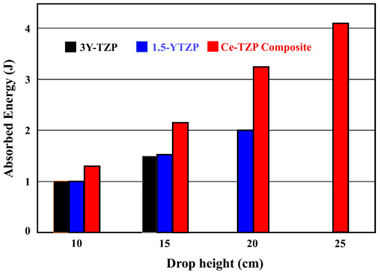 The significantly high energy absorption of the Ce-TZP composite, even at low drop heights (Figure 5), can also be attributed to the high transformability of this material, which is known to provide a ductile-like behavior to these composite ceramics under quasi-static bending and tensile testing [48]. In previous works [10,48], it has been shown that this material and other similar composites [6,9,10,50] exhibited low critical t-m transformation stresses, σc(t-m), compared to their flexural strengths, allowing t-m phase transformation to occur at relatively low stresses (e.g., σc(t-m)~300–400 MPa) before any crack propagation, inducing nonlinear behavior (~0.4% plastic strain at failure) and high energy dissipation before fracture. The plasticity in these Ce-TZP composites is exclusively linked to the stress-induced t-m zirconia phase transformation, as no microcracking and/or damage occurred during plastic deformation under flexural loading [10]. At low drop heights (10–20 cm), no significant difference was observed between the energy absorption in 3Y-TZP and 1.5Y-TZP, as the t-m phase transformation zone was not sufficiently developed in the latter under such conditions. This agrees with the high critical t-m transformation stress of 1.5Y-TZP, which is of the same order as its flexural strength, σR (i.e., σc(t-m) = σR~1000 MPa), placing it at the transition between brittle and ductile behavior [41]. This characteristic also explains the wider range of drop heights over which the risk of fracture under impact increases from 0 to 100% for 1.5Y-TZP (Figure 3). At low drop heights, the transformation zones in this material were not sufficiently developed, and its behavior was close to that of 3Y-TZP (brittle-like). However, it then becomes similar to that of the Ce-TZP composite at high drop heights (ductile-like), at which its t-m transformation becomes important.