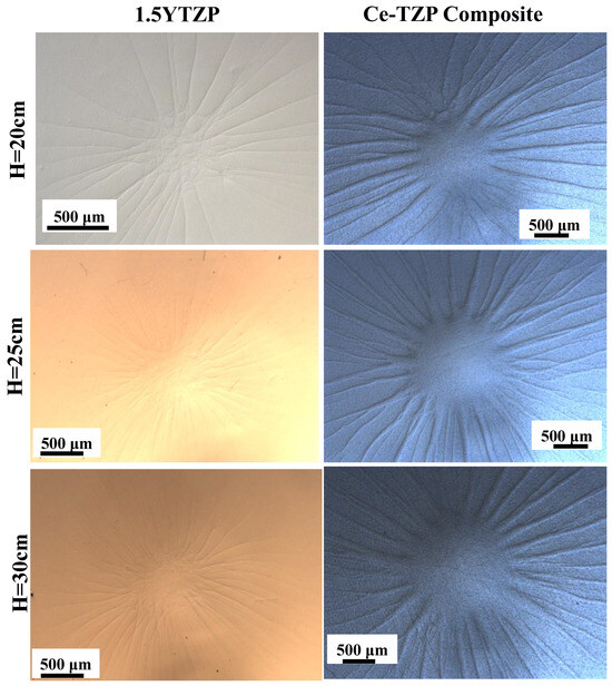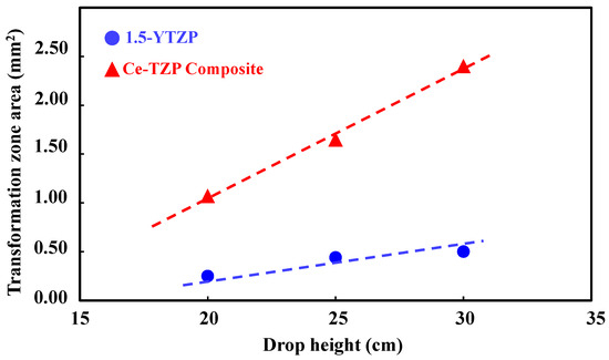 Optical observations of the tensile side of impacted and unbroken samples revealed the presence of t-m transformation zones in 1.5Y-TZP and the Ce-TZP composite, while no phase transformation was detected in the impacted 3Y-TZP zirconia. Figure 6 shows typical optical micrographs of the impact-induced t-m phase transformation zones for different drop heights. For heights above HC, only unbroken tested samples were observed. The transformation zones exhibited a star-shaped geometry, with a circular central transformed region from which radial bands extended towards the edge of the disk. The area of the transformation zone was evaluated by considering the transformed area within a circle corresponding to the effective surface in biaxial tests, as in [48]. Figure 7 shows the evolution of the impact-induced transformation zone area with drop height for the 1.5Y-TZP and the Ce-TZP composite. For both materials, the size of the transformation zone increases linearly with drop height (Figure 7), with consistently higher transformed areas for the Ce-TZP composite, which reached almost five times that of 1.5Y-TZP at a drop height of 30 cm (i.e., around 2.5 and 0.5 mm2, respectively).