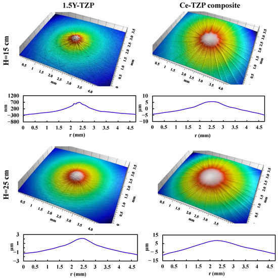 3D confocal microscopy observations confirmed the t-m phase transformation during impact testing and allowed quantitative analysis of the topography of impacted areas. Volume increase related to the t-m transformation (i.e., around 5 vol.%) was evidenced by circular dome-shaped zones, typical images of which are shown in Figure 8, where radial roughness profiles are also displayed. The effect of the impact on the t-m transformation extended over the sample (at least 5 mm in diameter around the impact point), as evidenced by the absence of a flat area in the 3D confocal images and analyses. For 1.5Y-TZP, roughness profiles revealed an increase of 2.4 µm in the maximum height of the transformation zone from 15 to 25 cm drop heights (1 and 3.4 µm, respectively). Similarly, for the Ce-TZP composite, the maximum height of the transformation zone increased by 9 µm over the same range of drop heights (i.e., from 9 µm at 15 cm to 18 µm at 25 cm).
