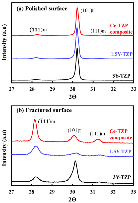 Evidence of t-m phase transformation in the studied materials during impact tests was also provided by XRD analysis of polished and fractured surfaces, as shown in Figure 9. The monoclinic phase content, (Vm), estimated on fractured surfaces after impact testing, was 80% for 1.5Y-TZP zirconia and the Ce-TZP composite, and 30% for 3Y-TZP zirconia.