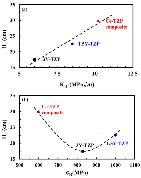 As outlined by several authors [52,53,54,55,56,57,58], the fracture toughness (KIC) is a key material parameter affecting the ballistic resistance of ceramic materials, as it measures the resistance to crack initiation. For the studied materials (Table 2), the higher the fracture toughness, the higher the impact resistance, following a linear trend, as shown in Figure 10a. In contrast, no direct relationship was observed between HC and strength, (σR), previously determined from four-point bending tests (Figure 10b) [41,48,59]. In particular, the material most resistant to impact (i.e., the Ce-TZP composite) displayed the lowest value of strength, indicating that strength has a weaker correlation with impact resistance than fracture toughness under the conditions of this study.