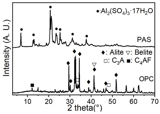 The polycarboxylate superplasticiser (SP, type 929) was purchased from FuClear Technology Co., Ltd. (Suzhou, China). Sodium metasilicate (Na2SiO3·9H2O, Analytical Reagent (AR) grade) was purchased from Aladdin (Shanghai, China). Calcium hydroxide (Ca(OH)2, AR grade), potassium hydroxide (KOH, AR grade), sodium aluminate (NaAlO2, CR grade), sodium sulphate (Na2SO4, AR grade) and sodium hydroxide (NaOH, AR grade) were purchased from Sinopharm (Shanghai, China). The chemical composition and mineral assemblage of OPC and PAS were identified by X-ray Fluorescence Spectrometry (XRF) and X-ray diffraction (XRD) and shown in Table 1 and Figure 1, respectively.