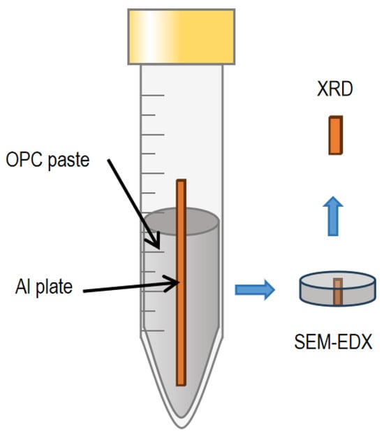 For the corrosion rate test of Al plates embedded in OPC pastes, OPC pastes were poured in plastic tubes of 15 mL, and Al plates sized 1 × 60 × 2 mm3 were inserted in the middle of the paste (Figure 2). Then, the plastic tubes were sealed, and the pastes were cured at room temperature for 3 and 28 days. The hardened OPC pastes were removed from the plastic tubes and cut into slices. The slices were then observed with a scanning electron microscope (SEM) and the element distribution was evaluated by an energy-dispersive X-ray spectroscope (EDX). The Al plates were also removed from the hardened paste and then transferred to XRD for mineral assemblage analysis.